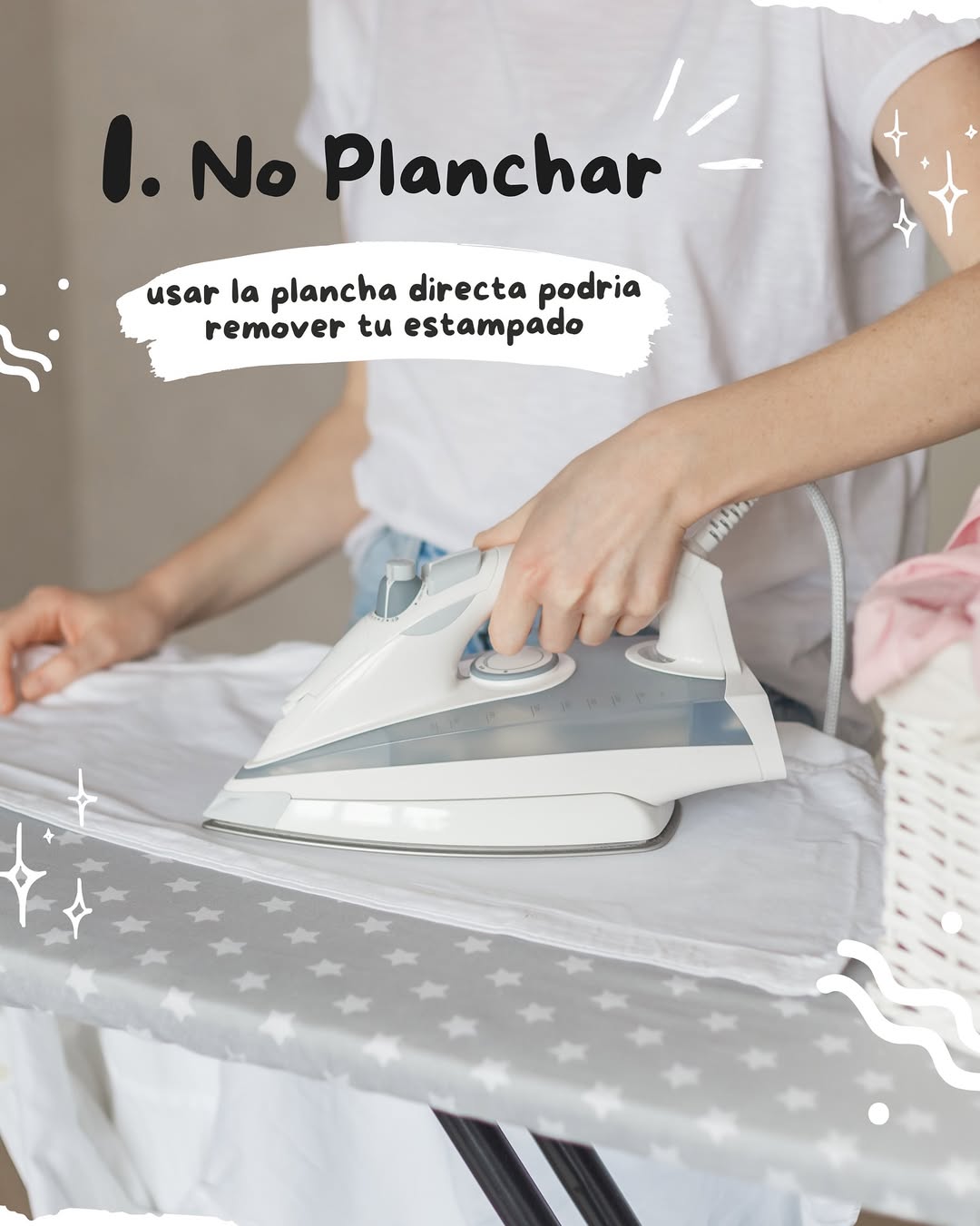 Planchar del revés y sin aplicar calor directamente sobre el estampado.